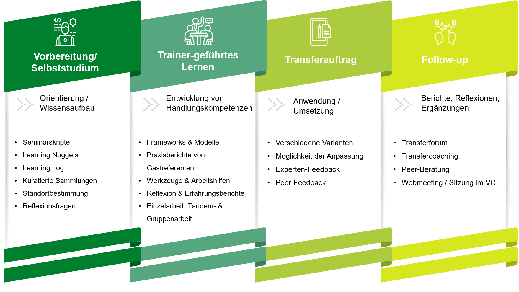 Flexibilität sowie Transfer- und Wirkungsorientierung sind wichtige Gestaltungsgrundsätze der SCIL Academy. Deshalb basieren unsere Weiterbildungsmodule und Webinar-Reihen auf einem transferorientierten Blended Learning Design. Die folgenden Gestaltungselemente sind zentral: