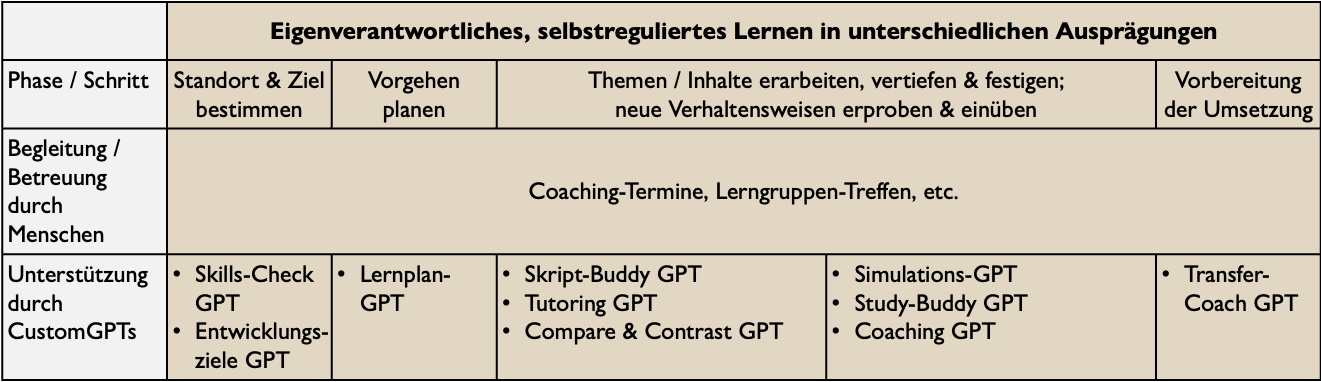 Vor diesem Hintergrund eröffnen die Entwicklungen im Bereich der generativen KI (ChatGPT & Co) neue Möglichkeiten. Spezifisch konfigurierte CustomGPTs können selbstorganisiertes Lernen über verschiedene Phasen hinweg wirksam unterstützen.
