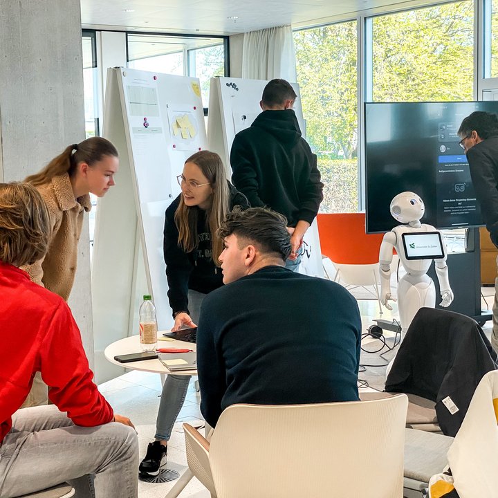 Peer Learning: Auf deiner Zeitreise, Discovery Tour und im Design Studio wirst du begleitet von Studierenden der Wirtschaftspädagogik und der Informatik der HSG.